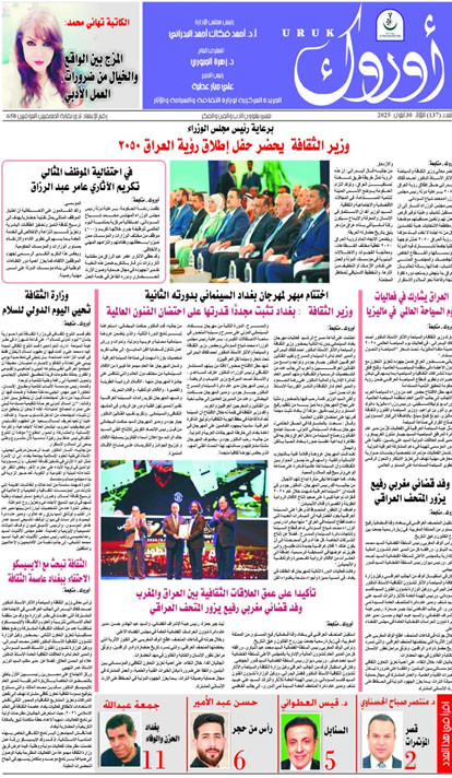 صدر العدد (137) من جريدة (أوروك) الجريدة المركزية لوزارة الثقافة والسياحة والآثار، مؤكداً التواصل الثقافي والمعرفي والجمالي بتعزيز قيم الفكر والثقافة والفن والإبداع، وعكس الحراك الثقافي، واستعادة العافية،والاحتفاء بالضوء والبناء والفرح، ومنها حفل إطلاق رؤية العراق ٢٠٥٠ الذي حضره وزير الثقافة والسياحة والآثار الأستاذ الدكتور أحمد فكاك البدراني، وكذلك الاختتام المبهر والناجح لمهرجان بغداد السينمائي بدورته الثانية، وغيرها من الفعاليات.