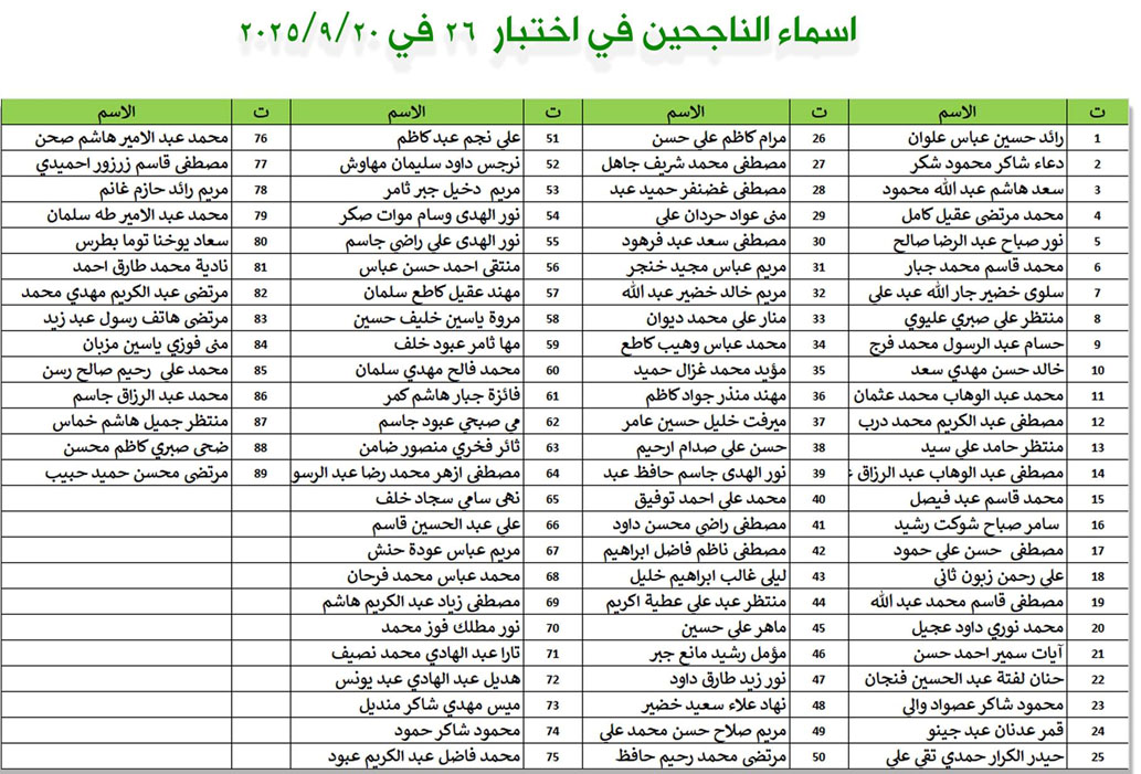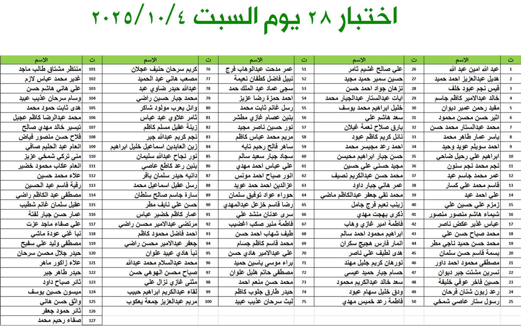 وذكرت النقابة في بيان تلقته «الزوراء»: ان لجنة اختبار الكفاءة المهنية في نقابة الصحفيين العراقيين ستقوم بإجراء اختبار خريجي كليات الاعلام ومن العاملين في المؤسسات الصحفية (انتماء وتغيير صفة) من سكنة محافظة بغداد ( الوجبة 28) في الساعة التاسعة من صباح يوم السبت المقبل الموافق 2025/10/4 في القاعة المركزية لنقابة الصحفيين، وننشر هنا الاسماء المشمولة بالاختبار .