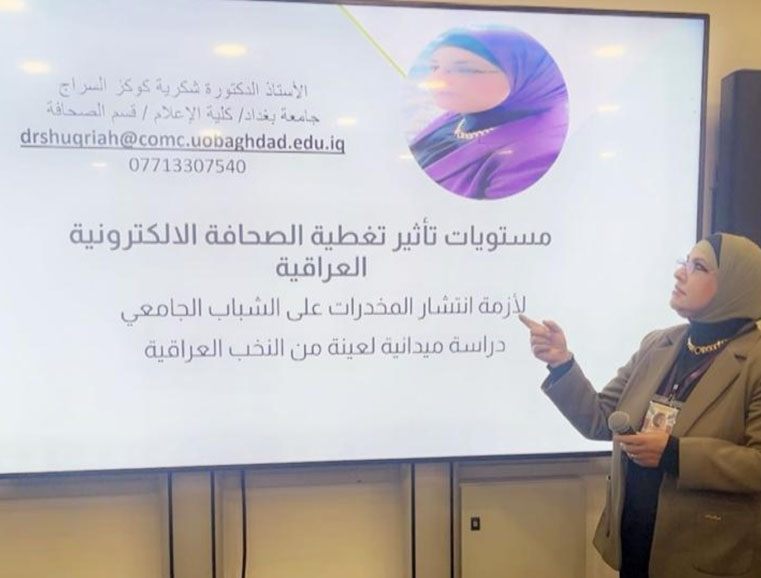 وقدمت دراسة بعنوان “تأثير تغطية الصحافة الإلكترونية العراقية لأزمة المخدرات على الشباب الجامعي”، استندت إلى عينة من ٤٠٠ مشارك من الأكاديميين والإعلاميين والأمنيين والدينيين.