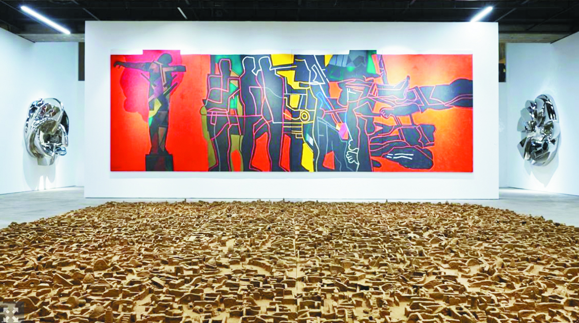 نعود إلى الأحمر والأسود، نحن هذه المرة أمام لوحة فيها ما يبدو موكباً، يظهر فيه أشخاص، وينقطع المشهد لنرى في آخره ما يشبه أن يكون شخصاً ممدوداً، في وسط اللوحة. هكذا نحن لا نزال في الرواية، قد تكون اللوحة الملونة المشرقة، التي تلي، فصلاً آخر. نحن بعد الدمار أمام ما يمكن أن يكون انفجاراً ضوئياً، ثم هناك، في النهاية، مدينة السيراميك المطروحة أرضاً على طول مساحة القاعة.