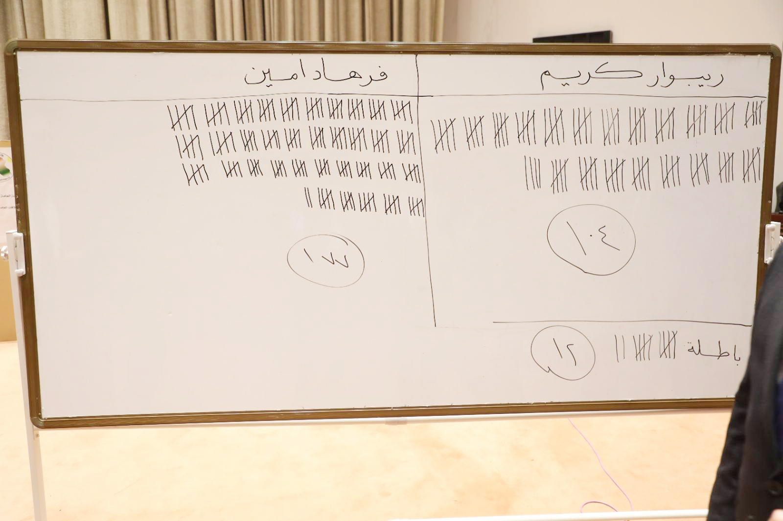 واضافت: ان النائب فرهاد الأتروشي حصل على 178 صوتا، بينما حصل النائب ريبوار كريم: 104 اصوات، في حين الاوراق الباطلة: 12 صوتا ، مؤكدة ان عدد المصوتين:294 نائبا.