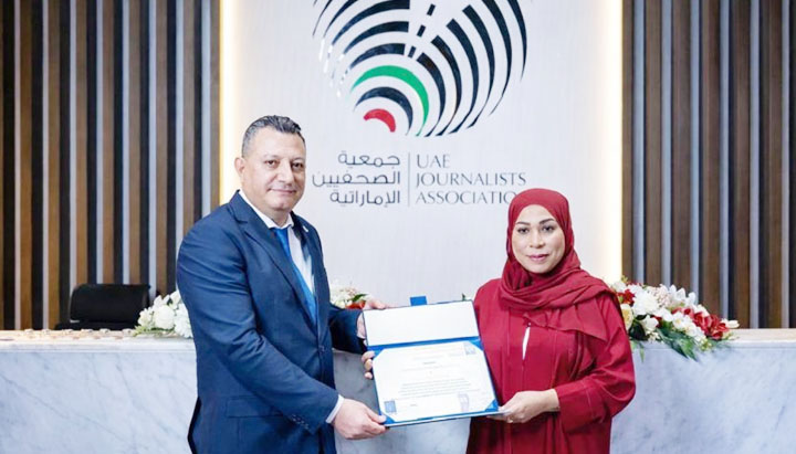 وجاء التكريم خلال زيارة وفد من المنظمة الدولية للصحافة والإعلام برئاسة خالد بكداش، إلى جانب وفد من شبكة رؤية الإمارات الإعلامية ورابطة رواد التواصل الاجتماعي، لمقر جمعية الصحفيين الإماراتية في دبي، في إطار تعزيز تبادل الزيارات وتوطيد التعاون مع المؤسسات الإعلامية المحلية والدولية.