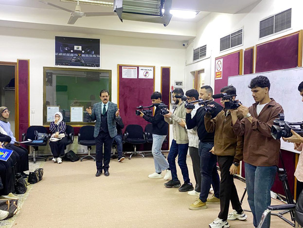 نظّم قسم الإذاعة والتلفزيون في كلية الإعلام بجامعة بغداد محاضرة تدريبية لطلبة المرحلة الأولى في الدراسة المسائية، بهدف تعريفهم بأساسيات العمل التلفزيوني وتنمية مهاراتهم العملية في مجال التصوير والإنتاج الإعلامي.