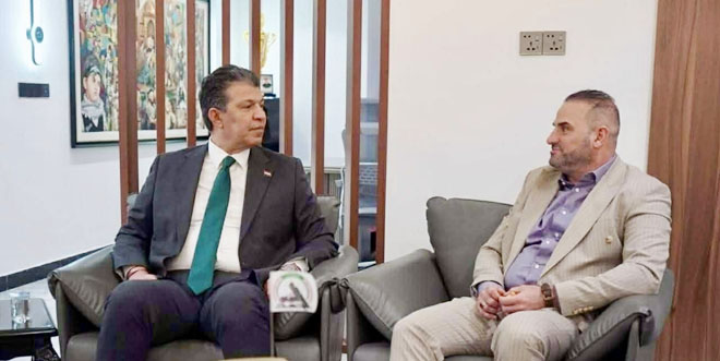 بحث رئيس شبكة الإعلام العراقي كريم حمادي مع مدير مديرية الإعلام في هيئة الحشد الشعبي مهند العقابي، آفاق التعاون المشترك بين شبكة الإعلام وهيئة الحشد الشعبي.