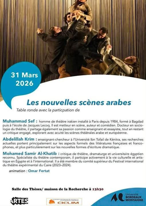 شهدت قاعة الأطروحات في دار البحث بجامعة بوردو مونتني الفرنسية انعقاد مائدة مستديرة ضمن فعاليات “المسارح العربية الجديدة”، بإدارة المسرحي عمر فرتات، وبمشاركة نخبة من الأكاديميين والمسرحيين العرب. شارك في هذه المائدة الدكتور محمد سيف، وهو مسرحي عراقي يقيم في باريس منذ عام 1984، تلقّى تكوينه الفني في بغداد، ثم واصل دراسته في مدرسة جاك لوكوك. يعمل مخرجًا وكاتبًا وممثلًا، وحاصل على درجة الدكتوراه في سوسيولوجيا المسرح. كما يشارك خبرته وشغفه في المجال الأكاديمي عبر التدريس وكتابة المقالات، إلى جانب نشاطه النقدي الذي يركز فيه على تحليل المشاهد المسرحية العربية والأوروبية بعمق.